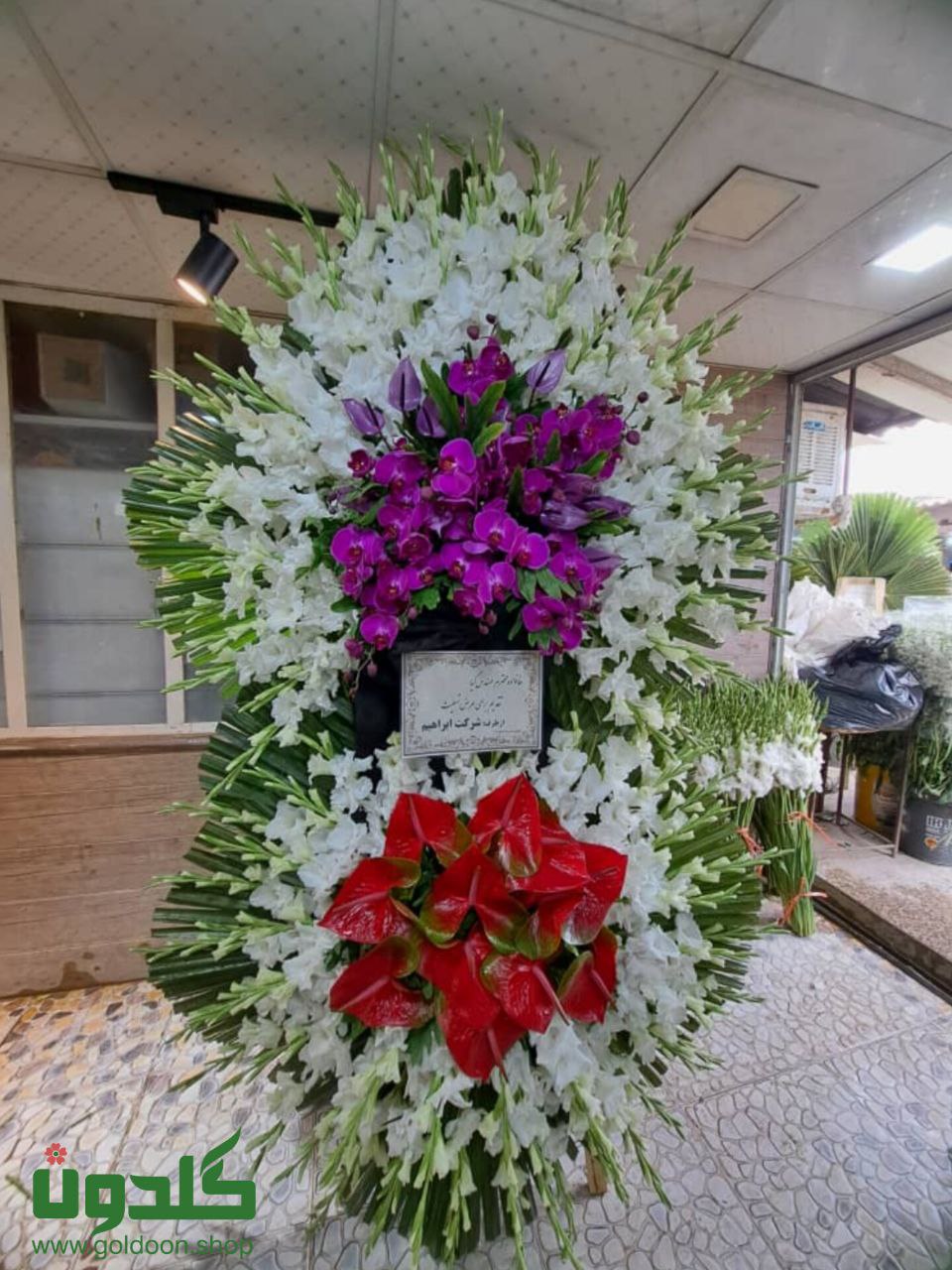 100شاخه گلایل، 7شاخه ارکیده،24شاخه انتریم،تزیین در پایه چوبی دوطبقه