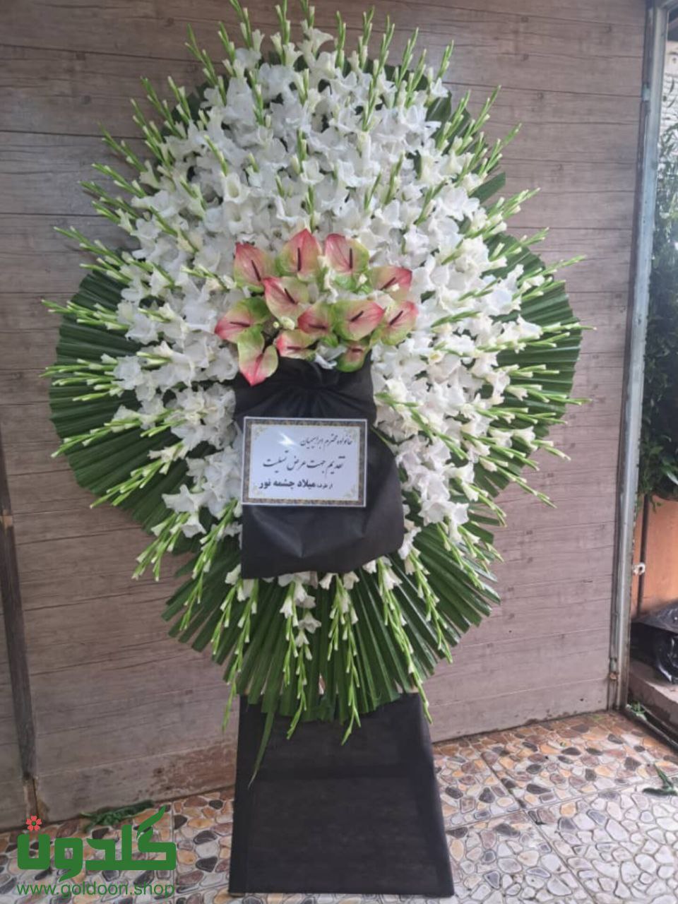 50شاخه گلایل،12شاخه انتریم،تزیین در پایه چوبی یک طبقه