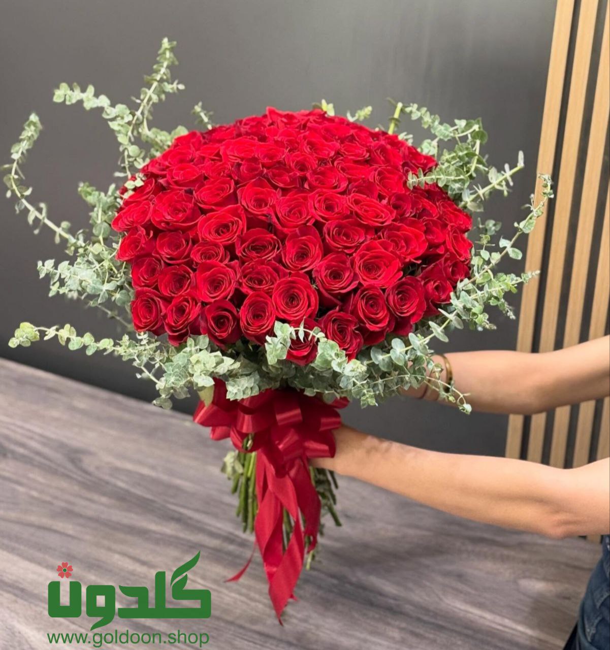 80شاخه رز هلندی ممتاز،تزیین ساده برگ اوکالیپتوس و روبان